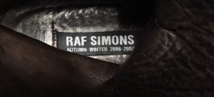 定番だった肩幅の狭いテーラードジャケットが無くなり、より上の年齢層をターゲットとして意識していたことが窺えるラフシモンズ2006年秋冬のブーツです。このシーズンは蛇腹のデザインが特徴的で、ブーツにも蛇腹デザインのものがあったのですが、今回掲載させていただくのは、コンバットブーツタイプです。実は当時、懇意にしていたバイヤーさんから「これは伊勢丹限定らしい」と伝えられていたのですが、画像をご覧の通り「SPACE」さん商流で販売された個体です。伊勢丹限定ではありませんでした。